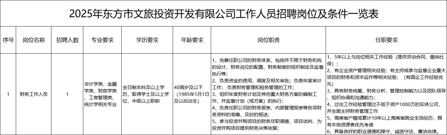 岗位要求:见附件《2025年东方市文旅投资开发有限公司工作人员招聘岗位及条件一览表》
